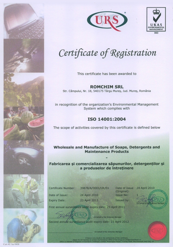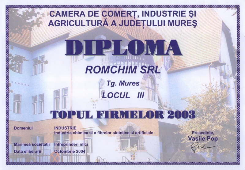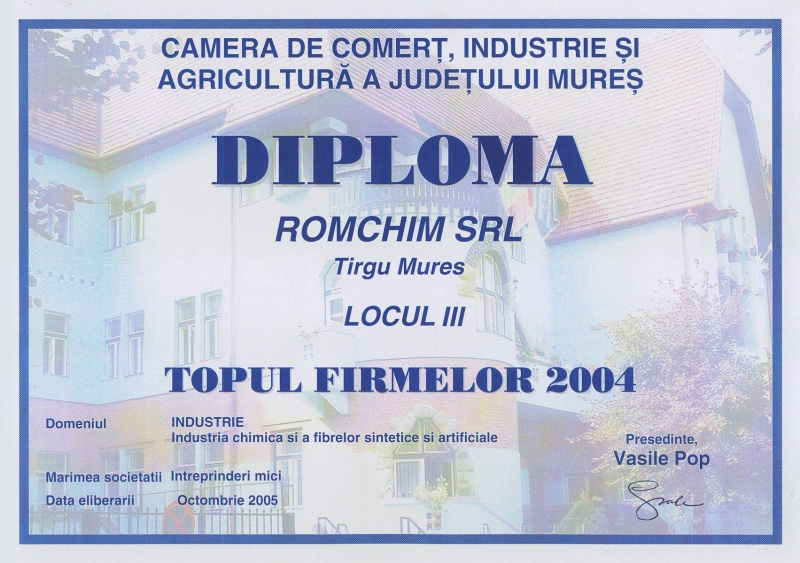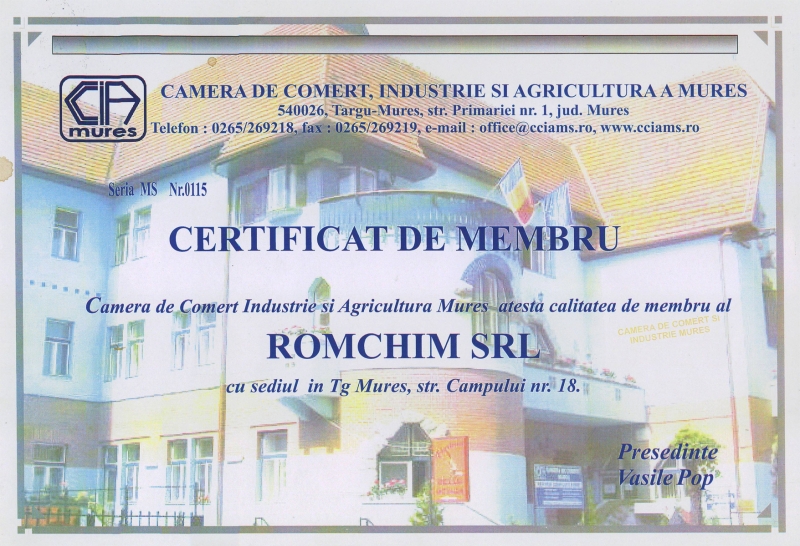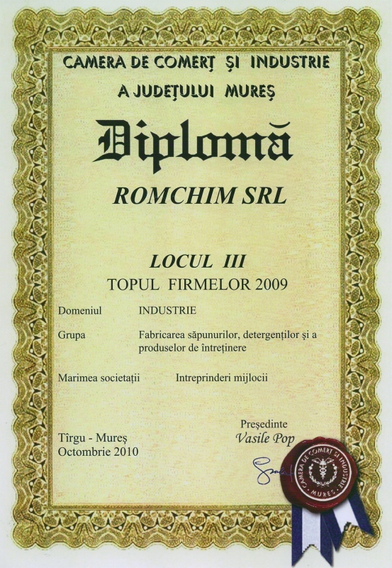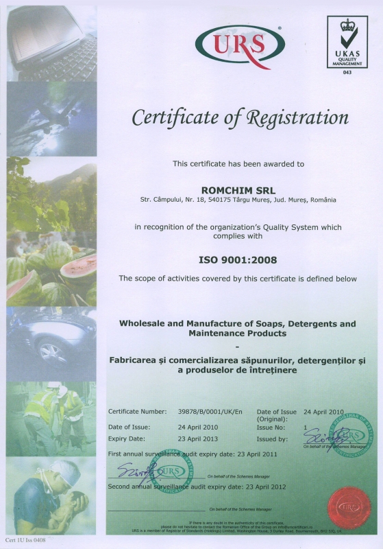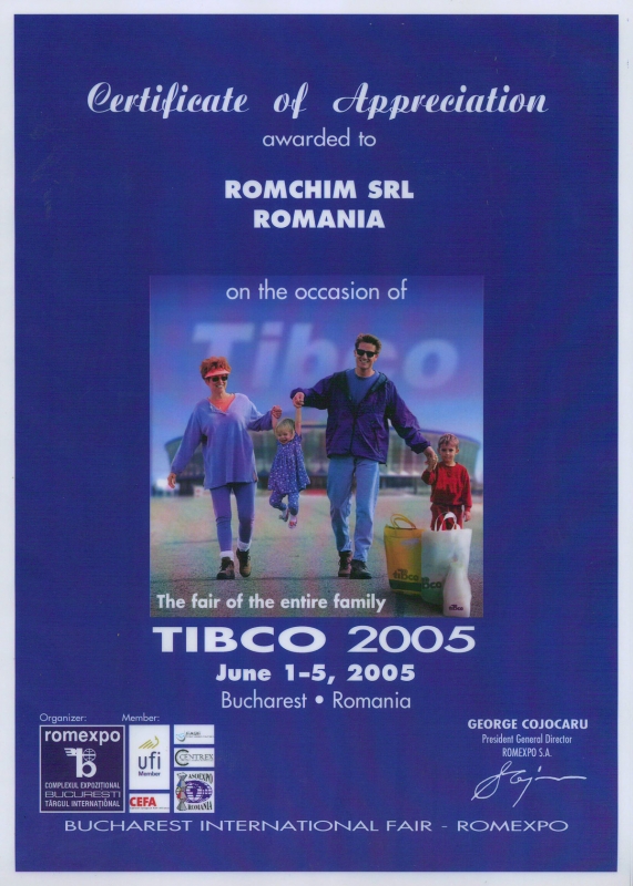 Originalitatea și calitatea produselor Romchim sunt recunoscute prin obținerea Certificatului Internațional de Calitate ISO 9001:2008 și ISO 14001:2004, respectiv de numeroasele diplome din ultimii ani.